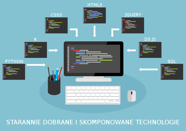 Użyte technologie (języki programowania, środowiska obliczeniowe, biblioteki wspomagające wizualizację danych, frameworki, protokoły itp.) stanowiące o możliwościach prezentowanego automatu raportującego to m.in: